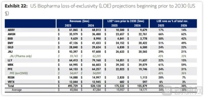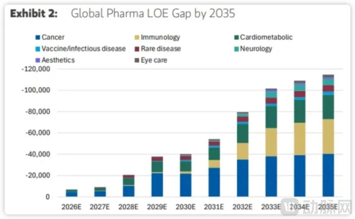 据摩根士丹利测算,截至2035年,MNC(主要是美国和欧洲药企)将因专利到期损失约1150亿美元收入,其中2030年前就有400亿美元的营收缺口。从治疗领域看,肿瘤(400亿美元)、免疫(330亿美元)、心血管代谢疾病(230亿美元)三大领域占比最高,达80%以上,是补位需求最迫切的赛道。